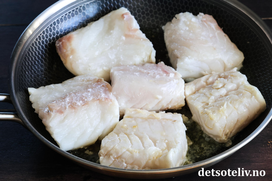 Varm opp smør i stekepannen og legg fiskestykkene i pannen (har du fiskestykker med skinn, legger du dem i pannen med skinnsiden vendende ned).
