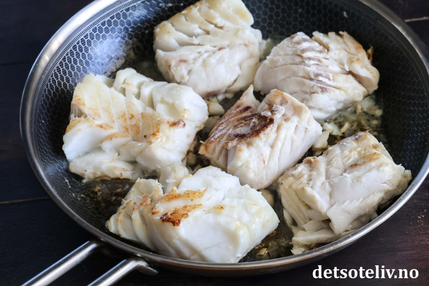 Stek fiskestykkene først på den ene siden på middels varme til du får en god stekeskorpe før du snur fiskestykkene og steker på den andre siden. Øs smøret i pannen over fisken noen ganger mens fisken steker. Ha på lokk og la fiskestykkene dampe i noen minutter til du ser at de flaker seg lett (som er et tegn på at de er ferdigstekte).