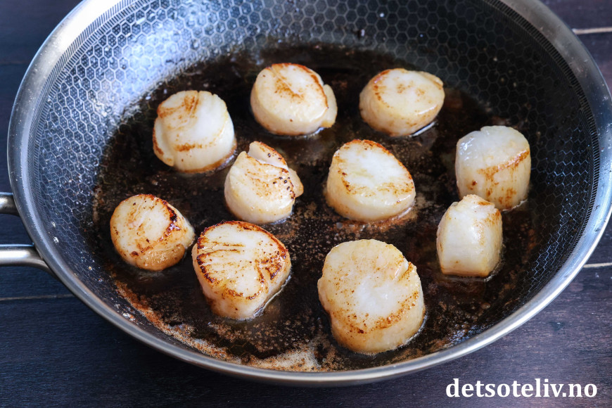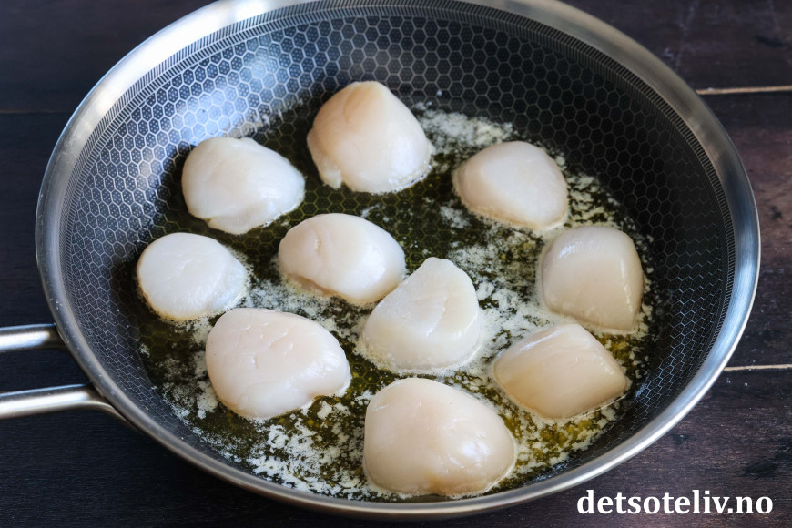 Stek kamskjell på høy varme i smeltet smør. Steketiden skal være kort, knapt 1 minutt på hver side.