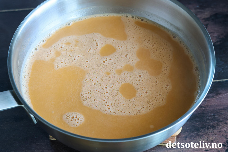 La sausen småkoke under omrøring til du ser at sausen er redusert til omtrent halvparten og tykkere i konsistensen.