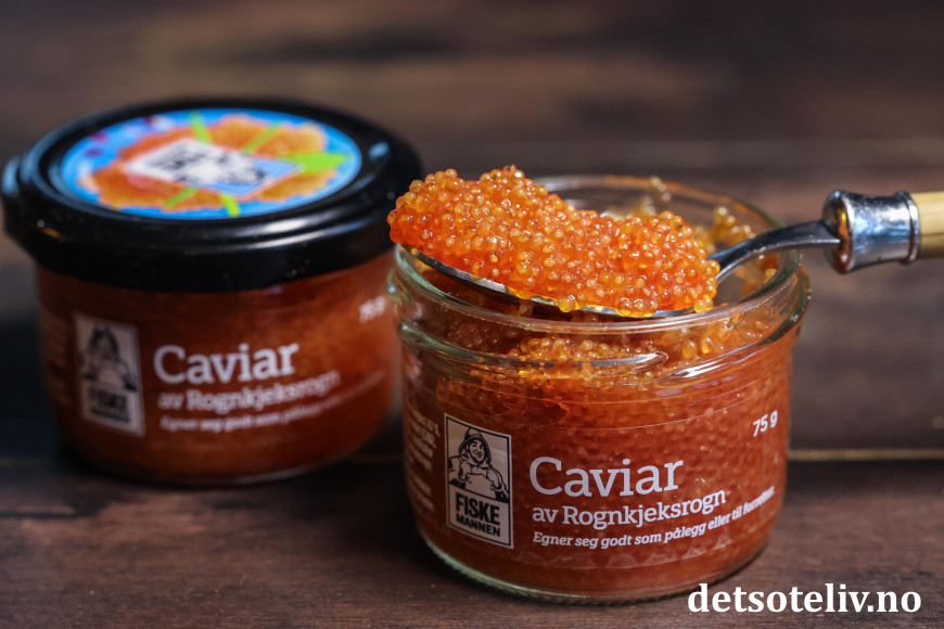 ♥ Du kan bruke den type rogn du liker best. Jeg brukte her steinbitrogn, som jeg synes er veldig god. Det går også bra å bruke lodderogn eller lakserogn, og får du tak i løyrom, er det enda bedre! Du kan eventuelt også røre litt av rognen inn i den ferdigkokte skalldyrsausen.