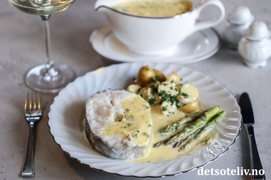 Serveres straks med kokte poteter, grønne asparges og sandefjordsmør som tilbehør.