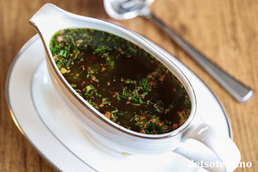 Rett før servering tilsettes fint hakkede urter, som kan være enten fersk persille eller gressløk eller en kombinasjon.