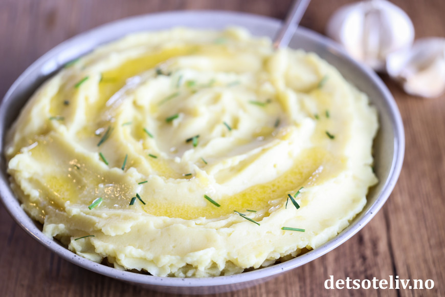 Mos de varme potetbitene med en potetstamper. Hvitløksfeddene er da så myke at de også lett vil bli most sammen med potetene. NB! Ikke bruk stavmikser (se tips).