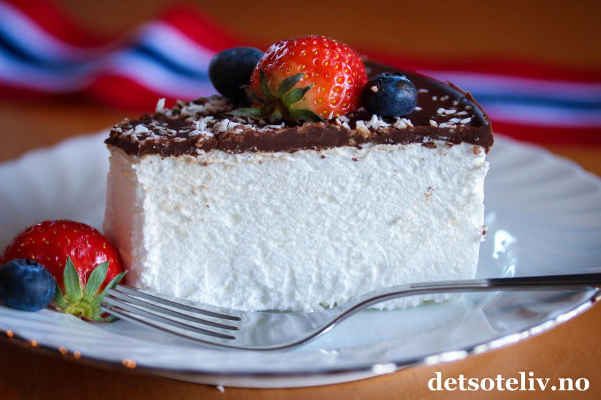 Kaken består av marengsskum som dekkes med sjokolade og kokosdryss.