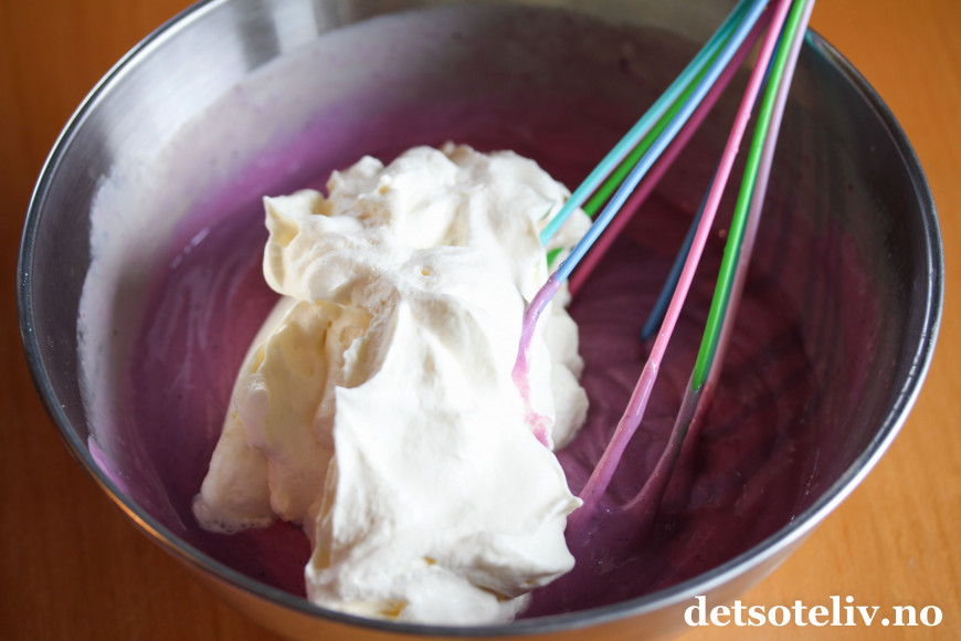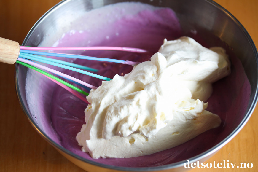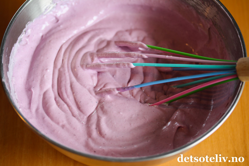 Til blåbærfromasjen blander man først sammen Skyr blåbær og melis.