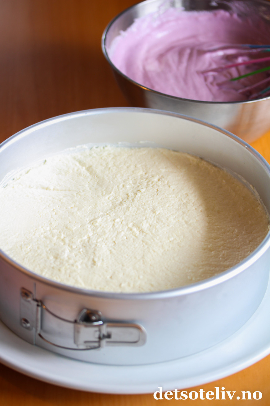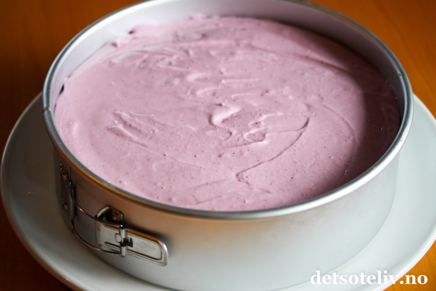 Hell Skyrfromasjen over kjeksbunnen i formen. Sett formen i kjøleskapet i 4-5 timer (eller over natten) så fromasjen stivner helt.
