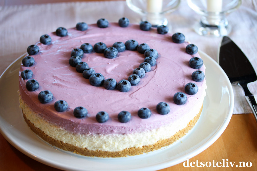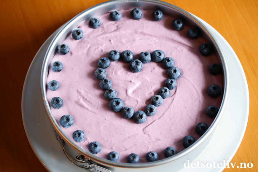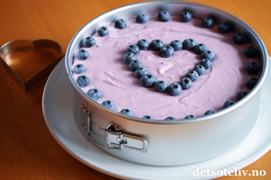 Pynt kaken med friske blåbær. Det er lurt å gjøre det før fromasjen har stivnet helt, så fester blåbærene seg godt til fromasjen. Tips hvis du vil legge blåbærene i hjerteform oppå fromasjen som jeg har gjort her: Bruk en hjerteformet utstikker for å markere et hjerte oppå fromasjen først, så får du får et pent og symmetrisk hjerte.