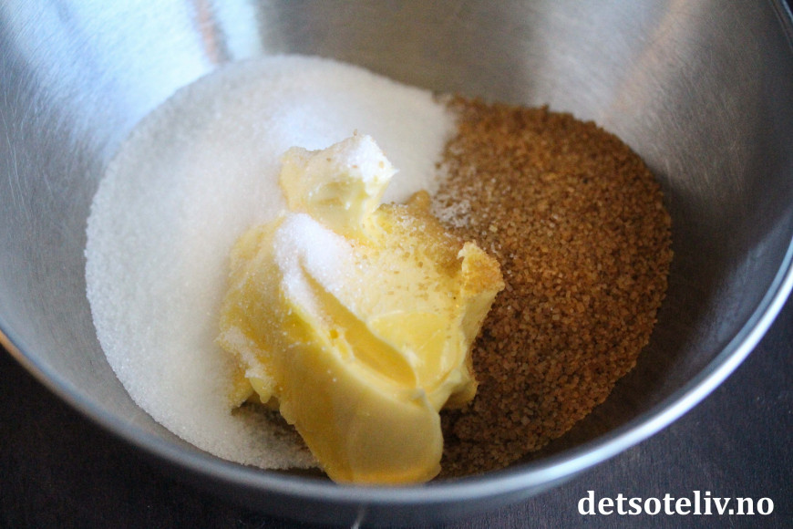 Pisk mykt, romtemperert smør sammen med hvitt og brunt sukker.