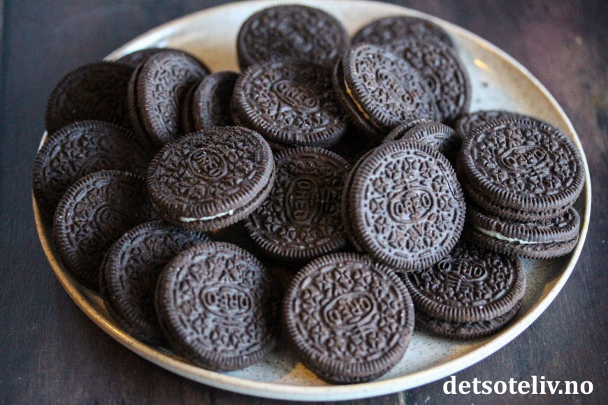 ♥ 20-25 Oreo-kjeks tilsvarer ca. 1,5 pakke, så kjøp 2. Husk at kjeksene skal brukes hele, inklusive den hvite kremen inni.