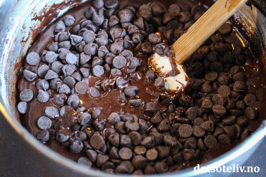 Vend så inn hvetemelet. Bland til slutt inn chocolate chips.