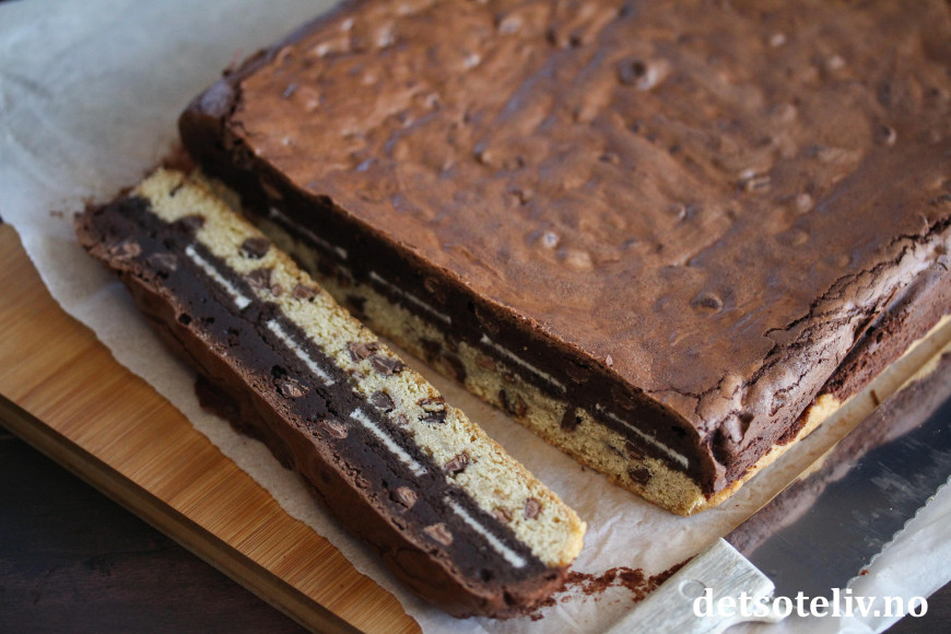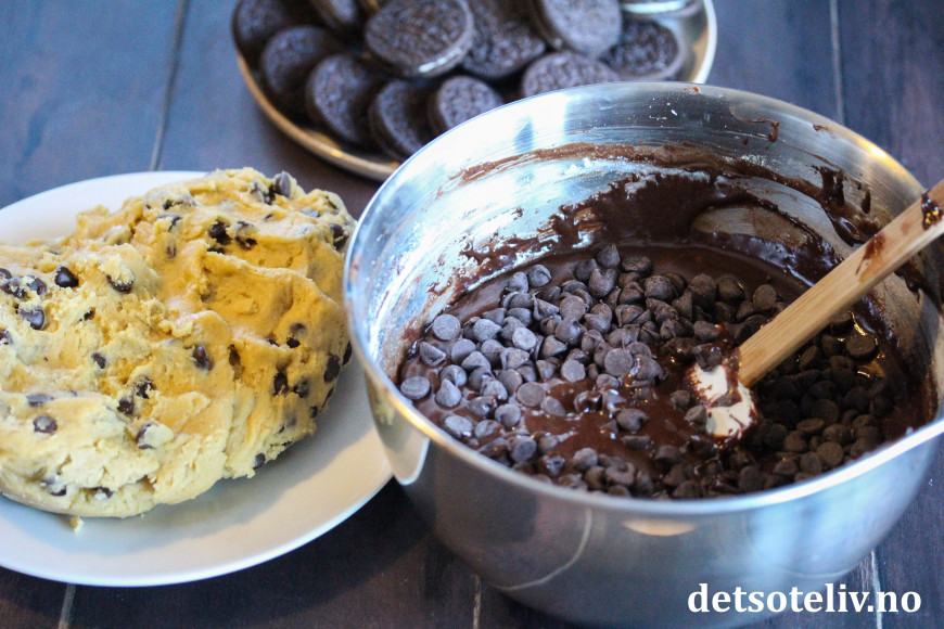 Denne kaken består altså av 3 lag: cookie-deig, Oreos og sjokoladebrownie.
