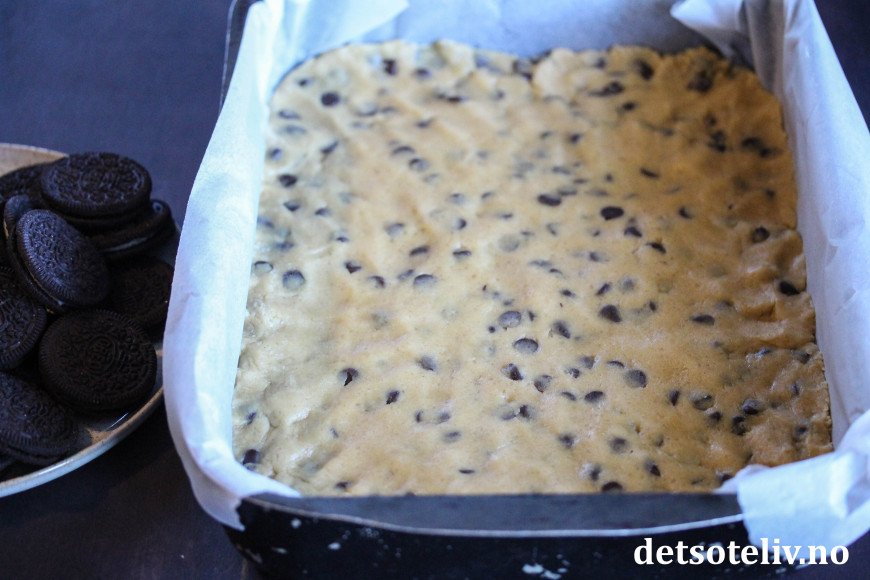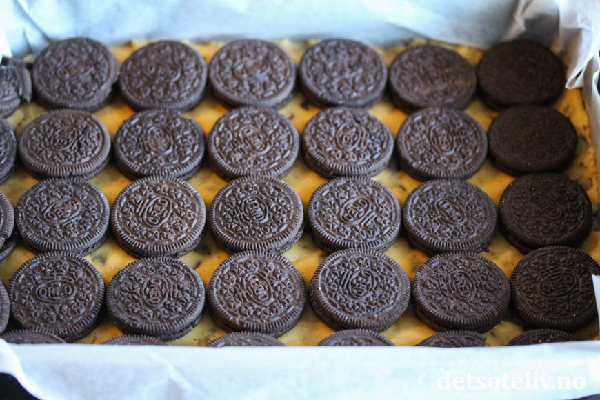 Dekk cookie-deigen i langpannen med hele Oreokjeks. Press kjeksen lett ned i cookiedeigen.