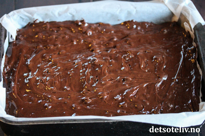 ♥ Vær nøye på å ikke steke kaken for lenge. Den skal ikke virke gjennomstekt når den tas ut av ovnen. Det er meningen at kaken skal beholde en "fudgy" konsistens, og for å få til det må kaken fortsatt virke litt ustekt når den tar ut av ovnen. Den stekte kaken blir fastere i konsistensen når den har fått stått kjølig en stund. La den gjerne stå i kjøleskapet over natten, så er du sikker på at den er fast i konsistensen, før du løfter kaken ut av langpannen og deler den i firkanter.