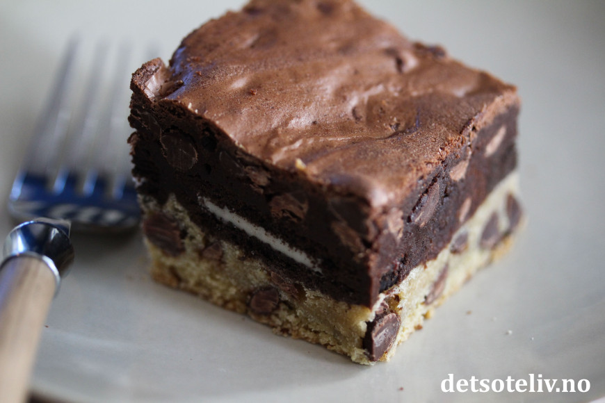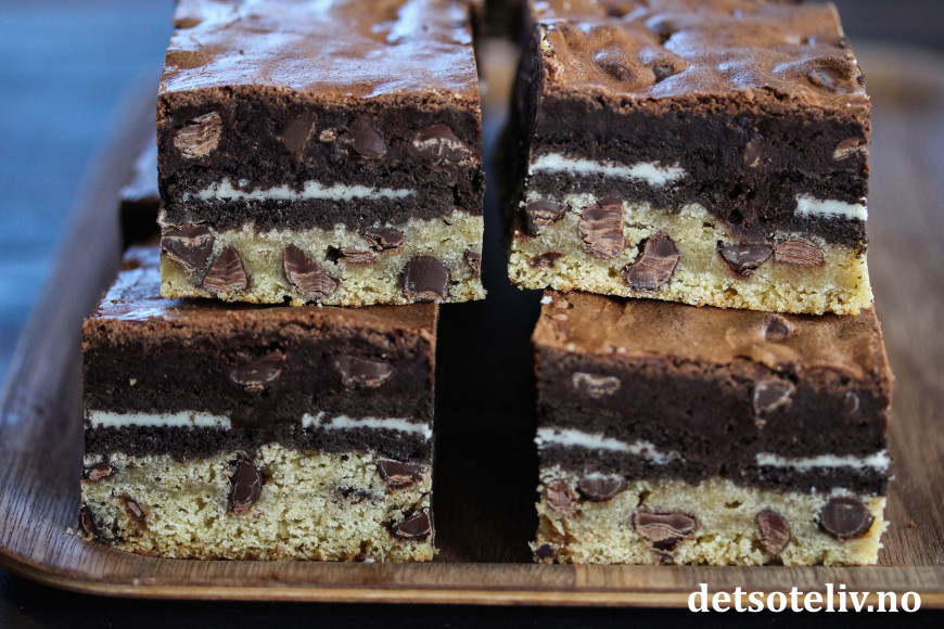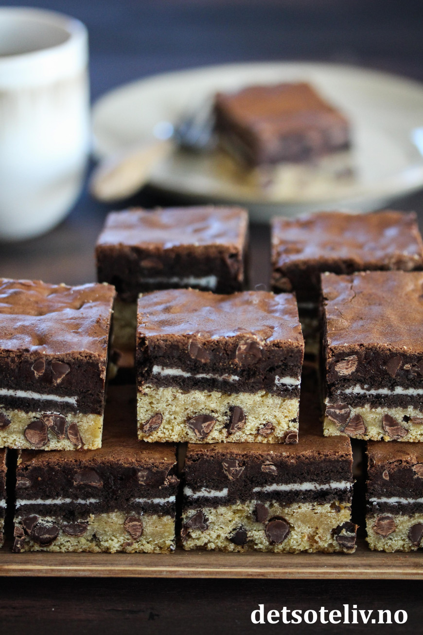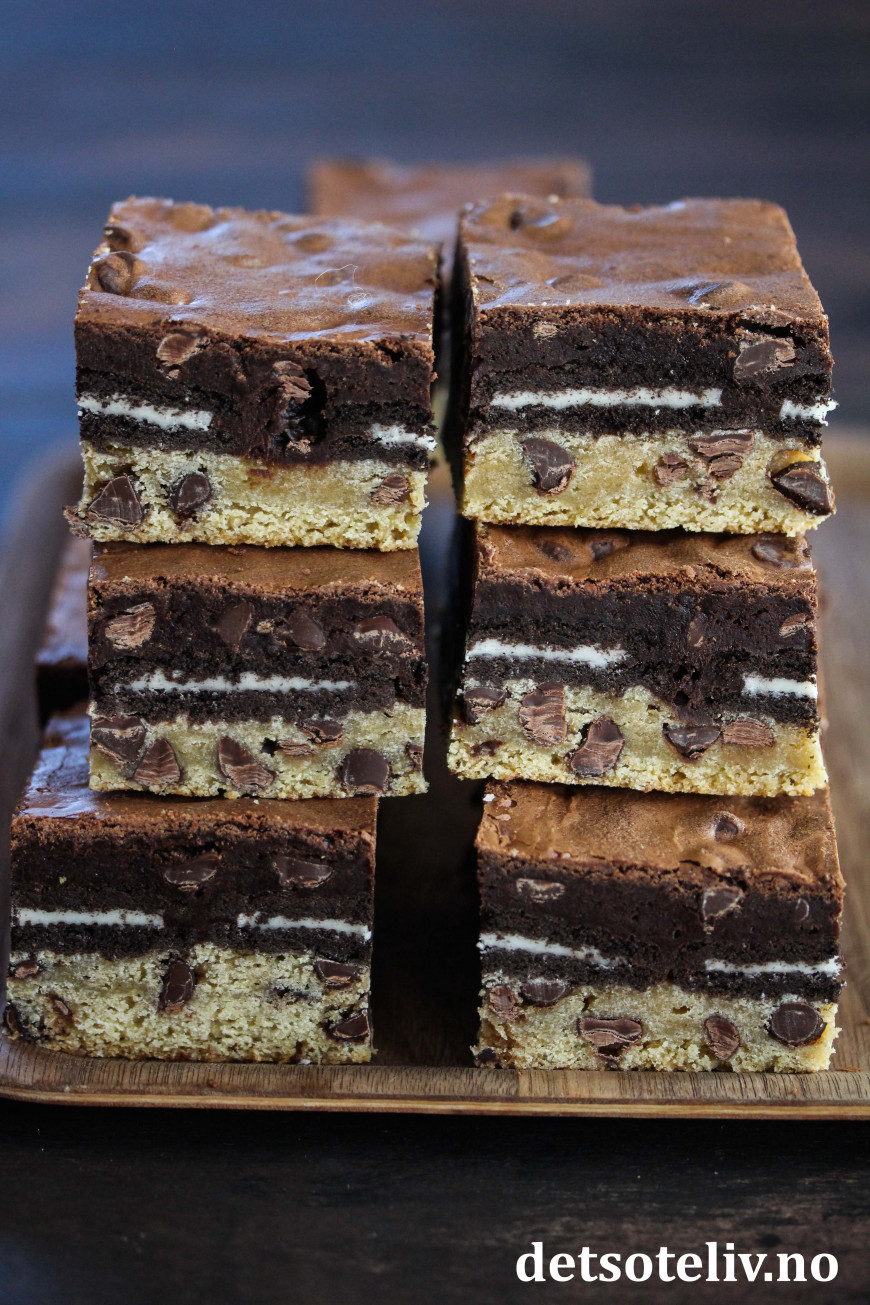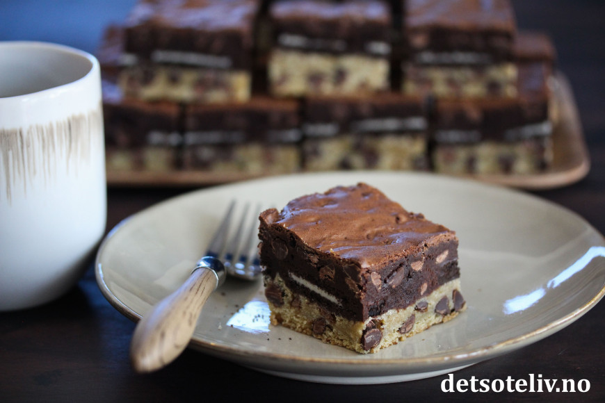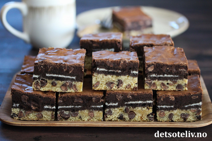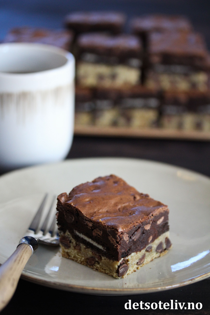 Her har du kjempepopulære brownies som kombinerer digg cookie-deig, Oreo-kjeks og bløt sjokoladebrownie i en og samme kake.