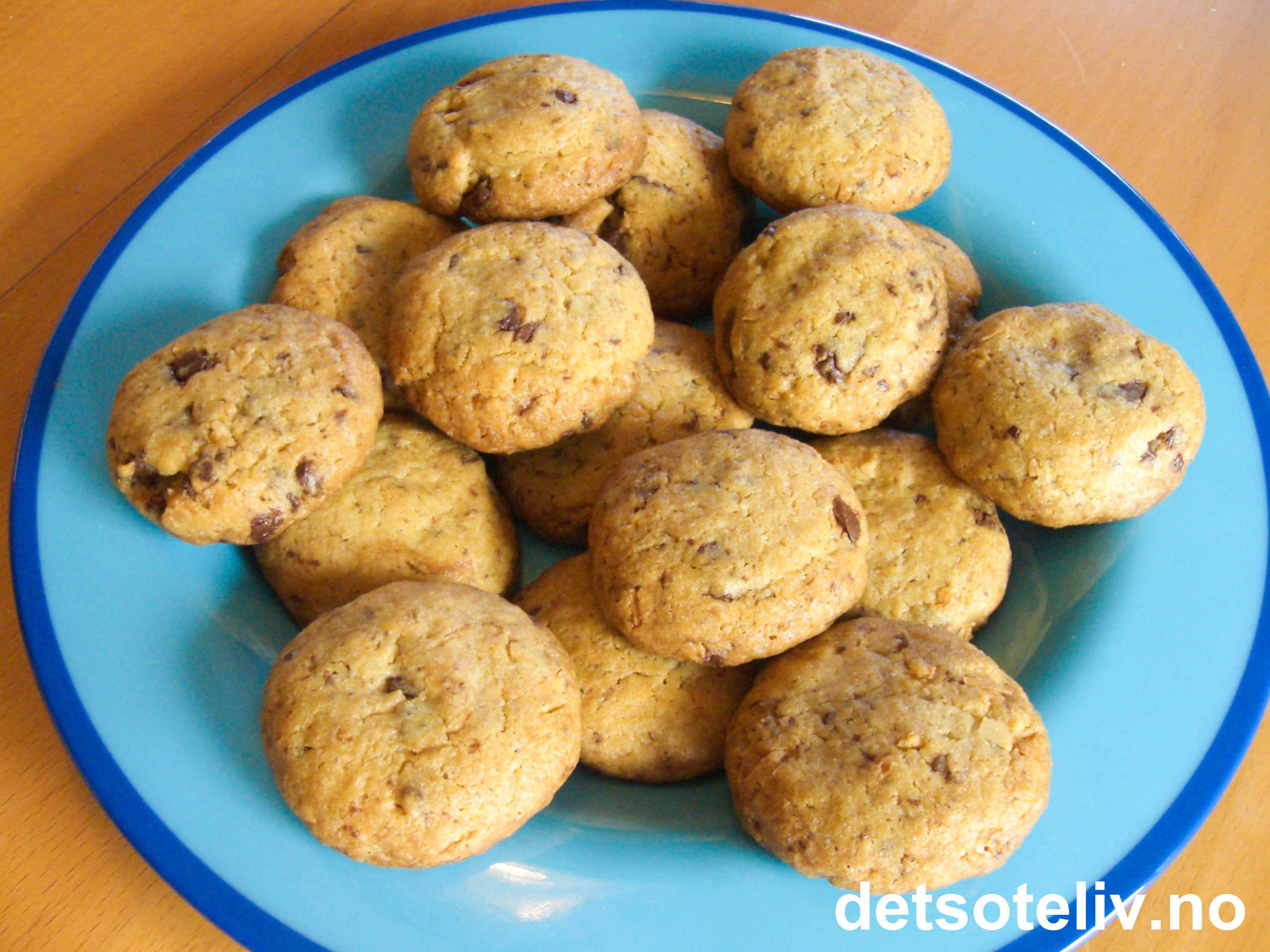 Pisk mykt smør sammen med sukker og brunt sukker. Pisk inn egget. Vend i natron og hvetemel. Bland inn kokos og fint hakket kokesjokolade til slutt.