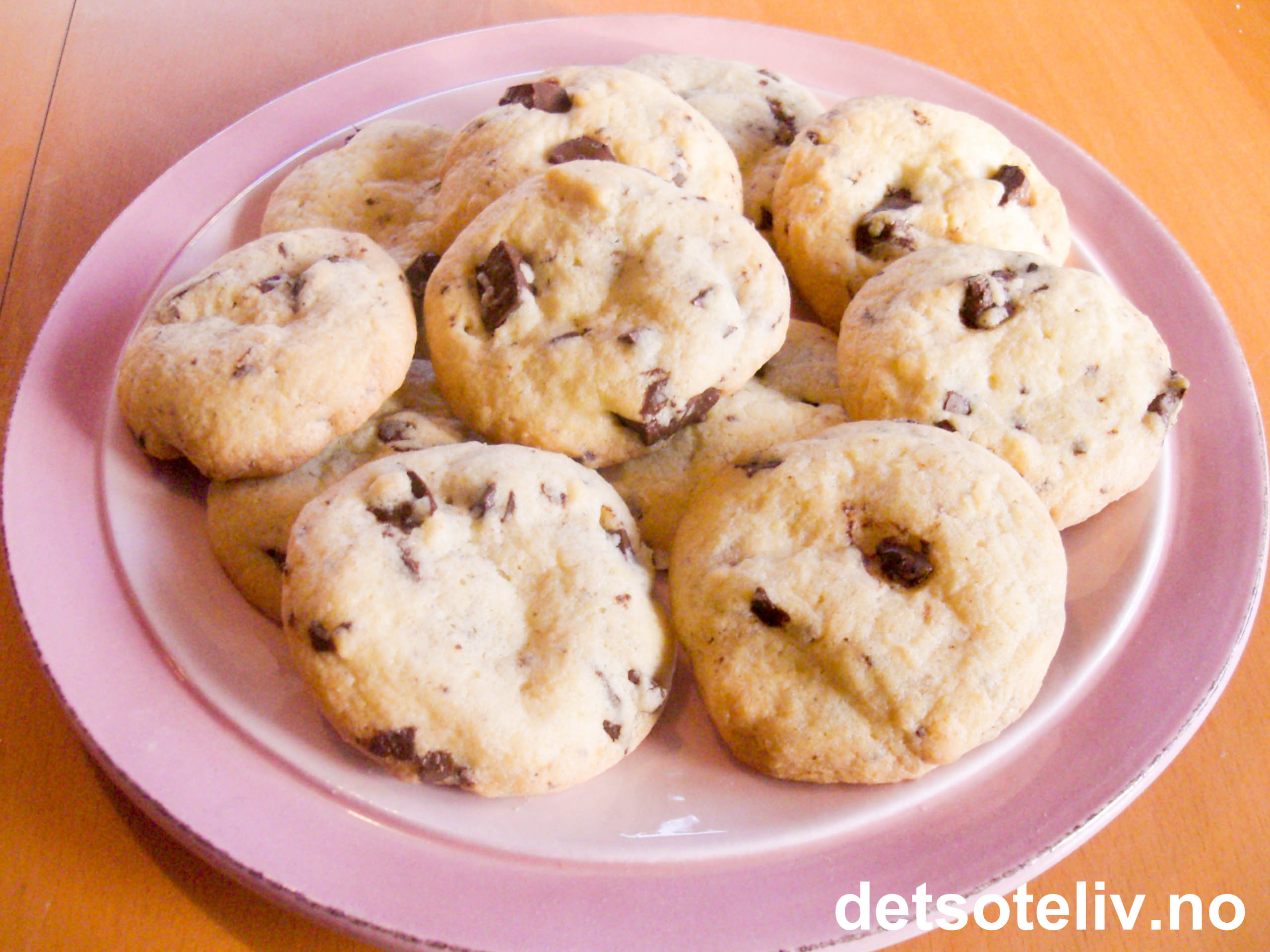 Pisk mykt smør, melis og sukker til smørkrem. Pisk inn eggene. Sikt sammen de tørre ingrediensene og bland sammen med smørkremen til en jevn deig. Kna til slutt inn hakket kokesjokolade.
