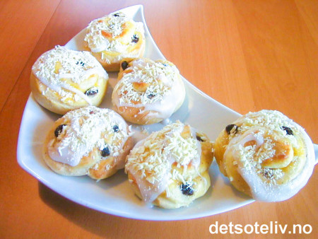 Stek bollene midt i ovnen ved 200°C i 12-15 min, eller til de er lett gyldne. Avkjøl bollene helt. Pynt de kalde bollene ved å ringle over litt glasur laget av melis og litt vann. Høvle til slutt over hvit sjokolade (se tips).