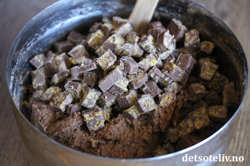 Hakk opp Smash-sjokoladen og vend inn i deigen til slutt.