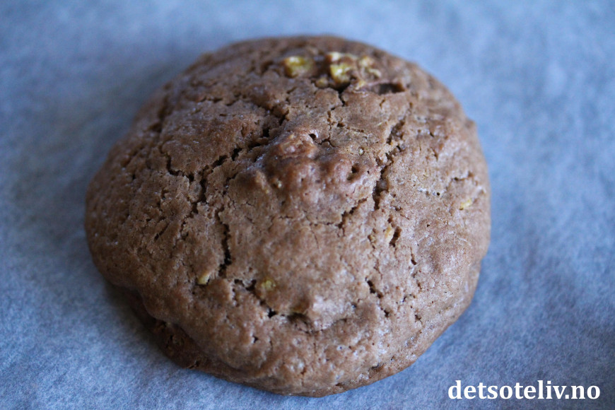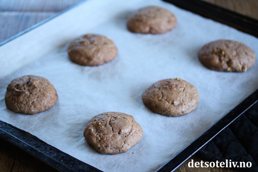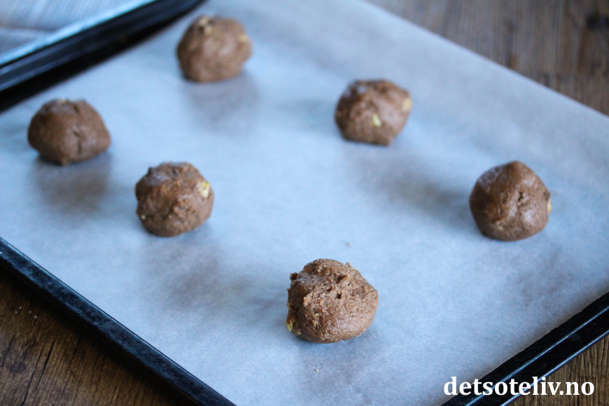 Form deigen til spiseskjestore, runde kuler som settes på bakepapirdekkede stekeplater. Ha noe avstand mellom kakene, for de flyter litt utover under stekingen.