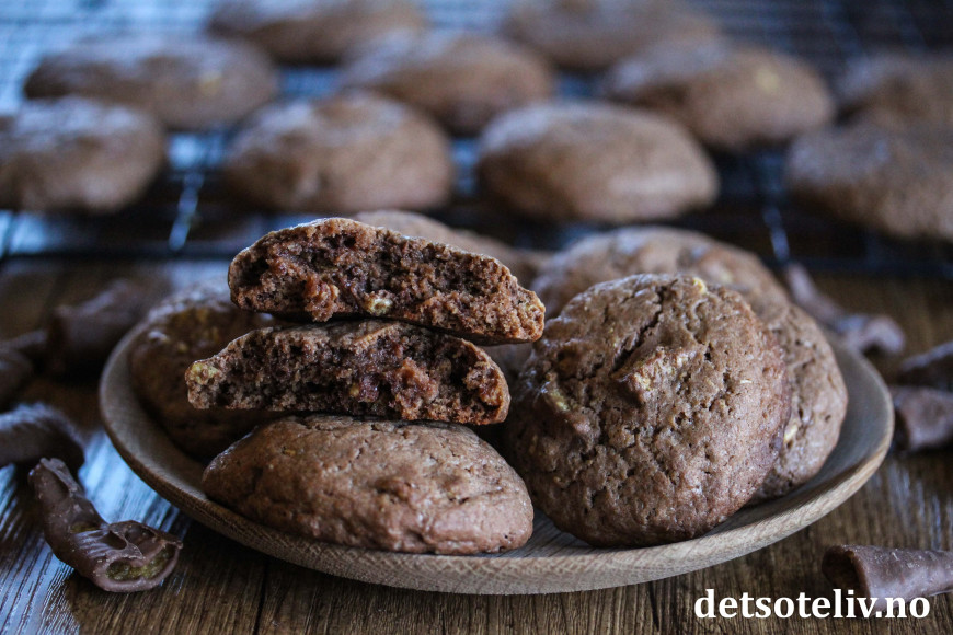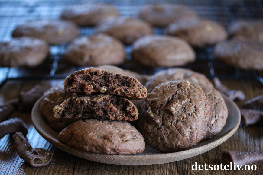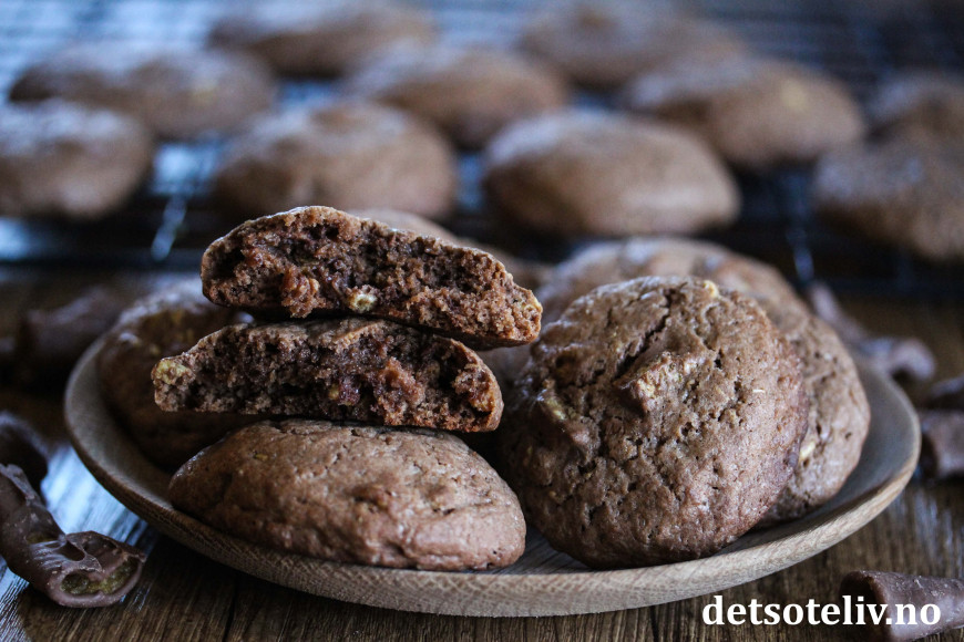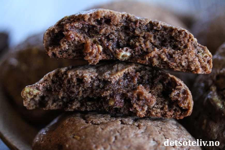 Pisk romtemperert smør sammen med hvitt og brunt sukker. Pisk inn eggene, ett om gangen, til du får en luftig smørkrem. Pisk inn vaniljeekstrakt, bakepulver og kakao. Bland så i hvetemelet til en jevn deig.