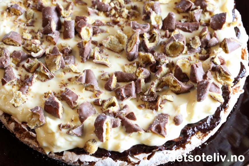 Fantastisk kake! Elsker smash, og kombinasjonen salt og søtt. Genialt for oss som ikke tåler nøtter:) jeg lurer bare på om du har forsøkt å lage kaken uten bunn nr 2 , vaniljekrem og laget med smash i midten? Jeg syns smashen inni kaken ble fuktig og dermed ikke såå god dagen etter.
