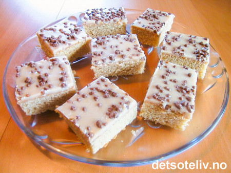 La glasuren stå i kjøleskapet til den har passe smørekonsistens. Bre den så over kaken med en smørekniv. Dryss over Daimkuler og la kaken stå i romtemperatur til glasuren har stivnet litt. Del kaken opp i firkanter.