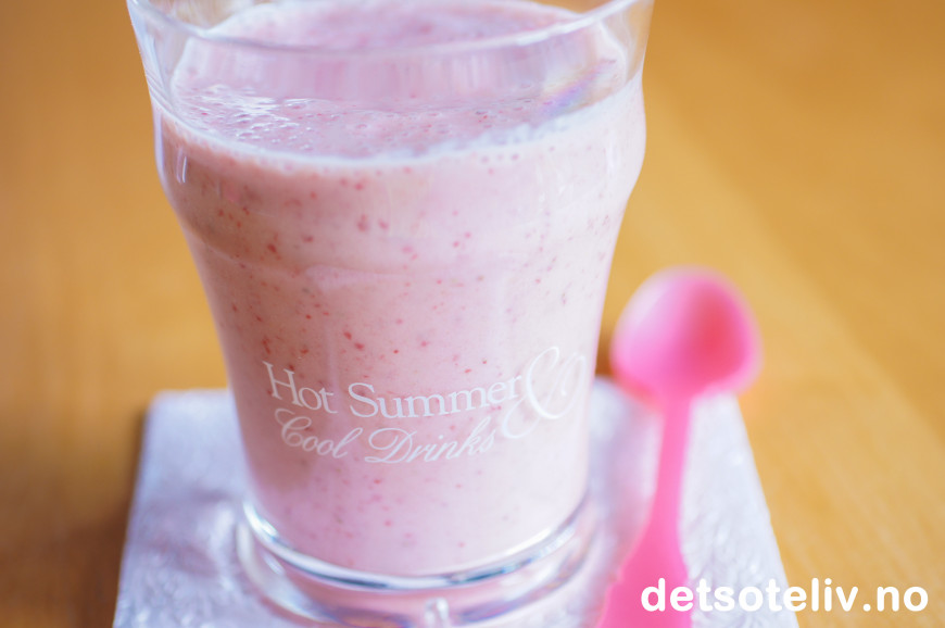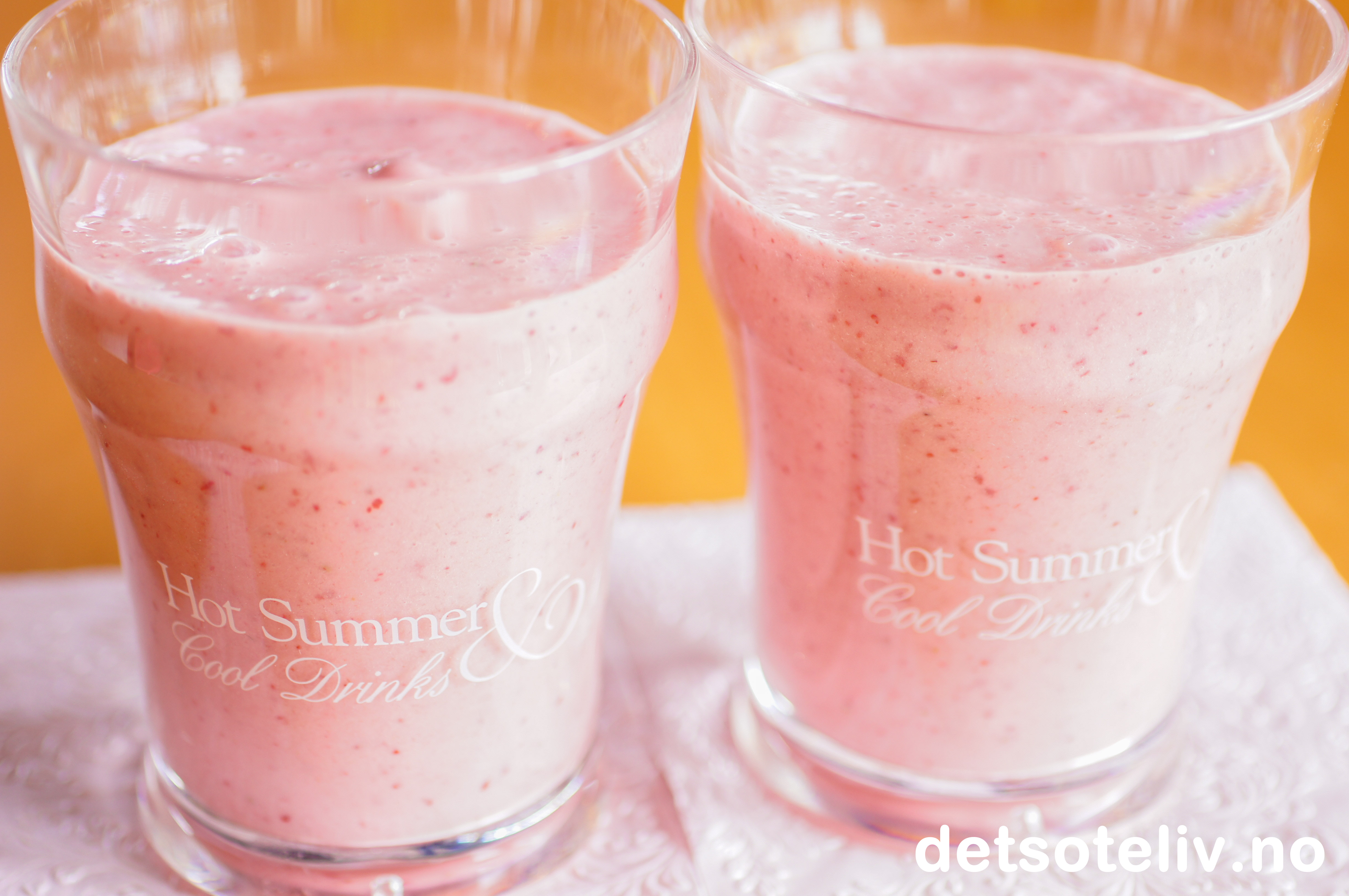 Her har du en frisk og deilig smoothie laget med frosne jordbær og jordbæryoghurt.