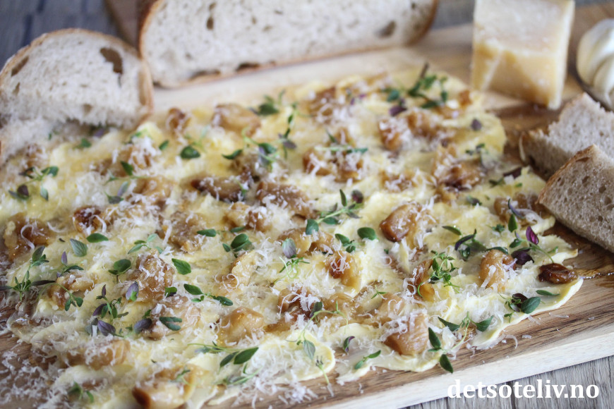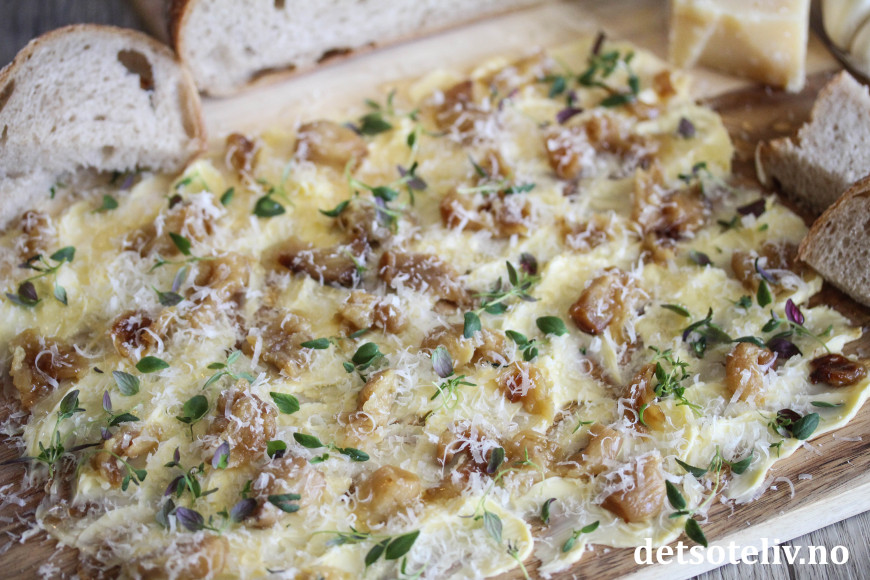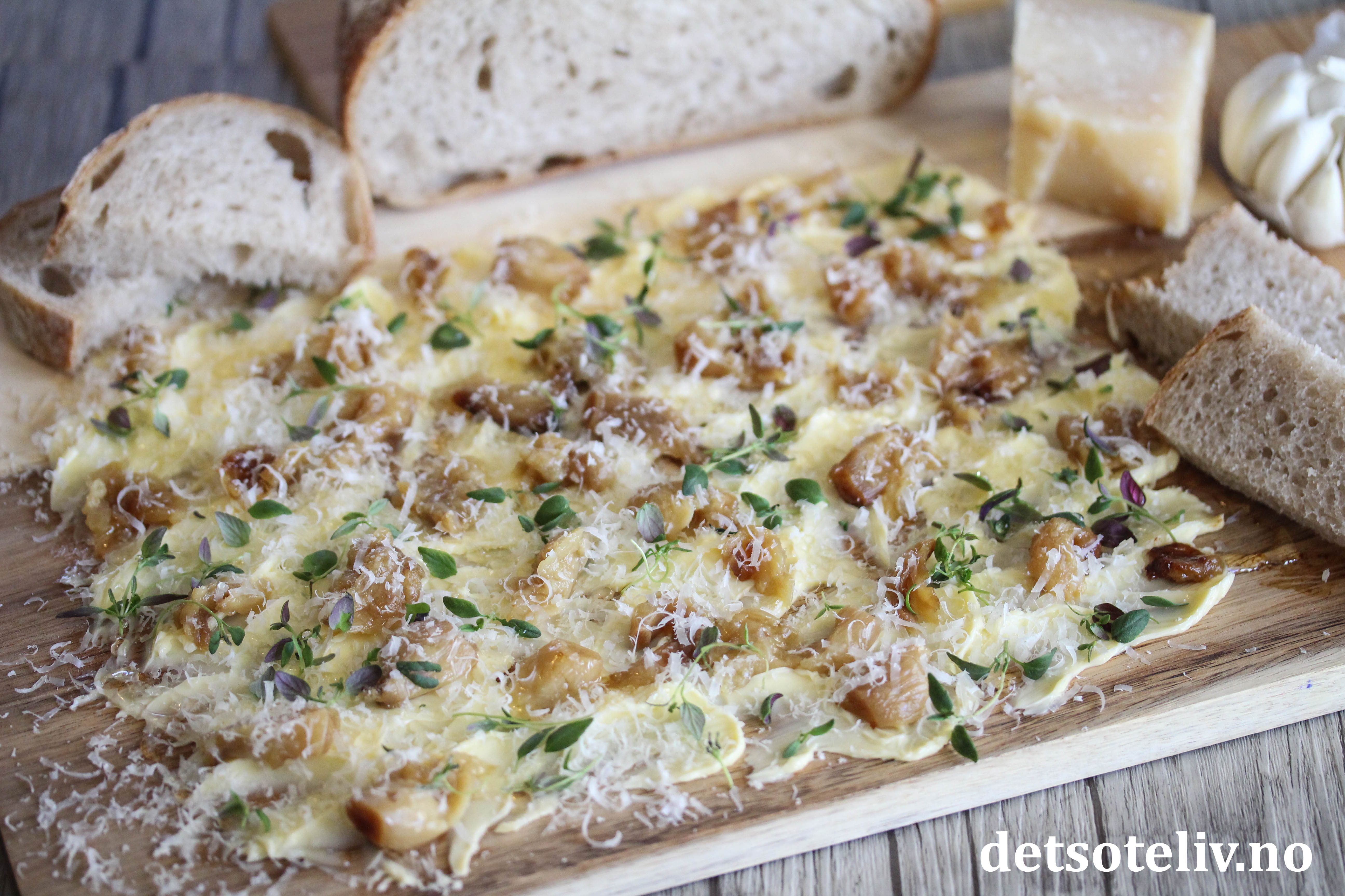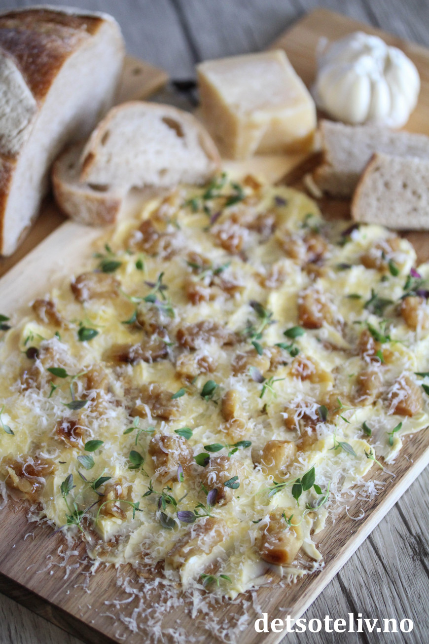 Her har jeg toppet smørbrettet mitt med ovnsbakt hvitløk. Når man baker hele hvitløk i ovnen, blir hvitløksfeddene bløte i konsistensen, og hvitløkssmaken blir mild og litt søtlig. Dette supernydelige hvitløkssmøret toppet jeg i tillegg med flaksalt, fersk timian, revet parmesan og honning.