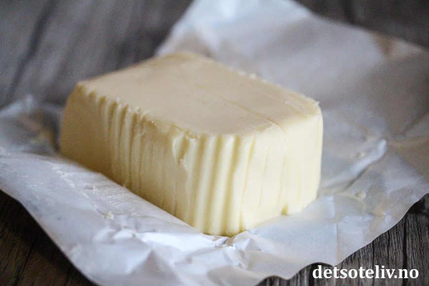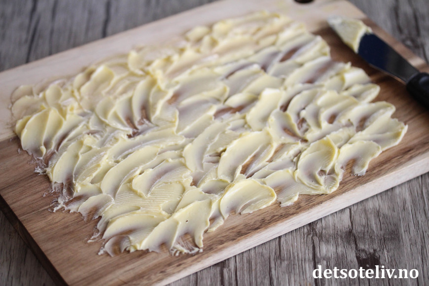 Finn frem en passe stor trefjøl (min er her ca. 20 x 30 cm). Sørg for at smøret er helt mykt og romtemperert.