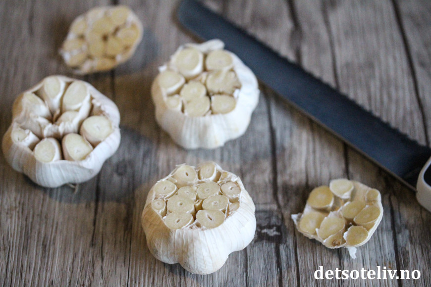 Skjær toppen av hvitløkene slik at man ser feddene åpenbare seg. Legg dem på et stykke aluminiumsfolie og drypp olivenolje over toppen.