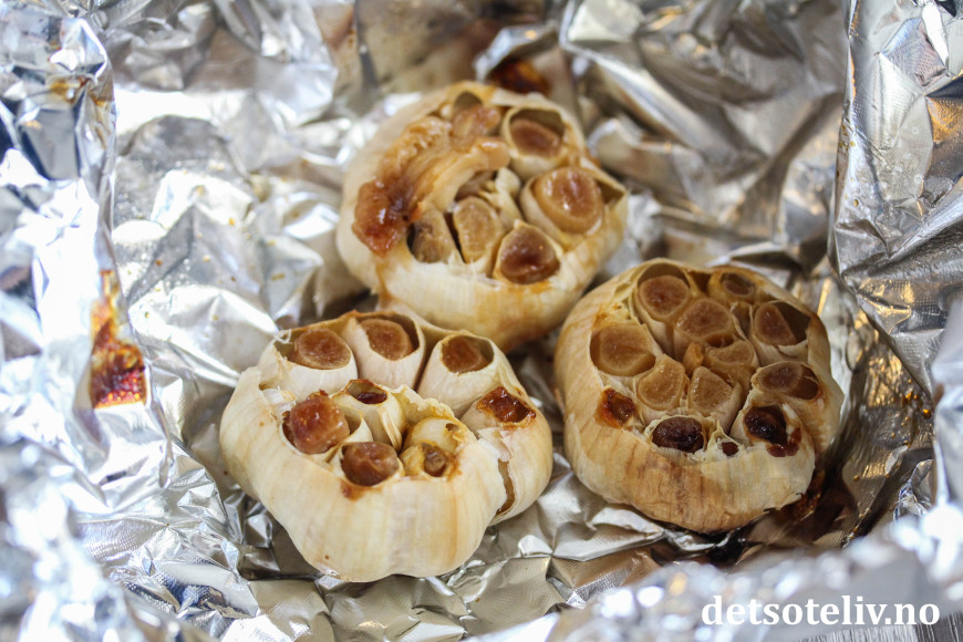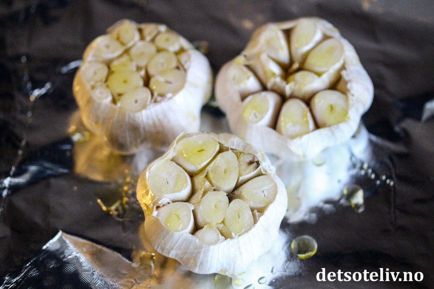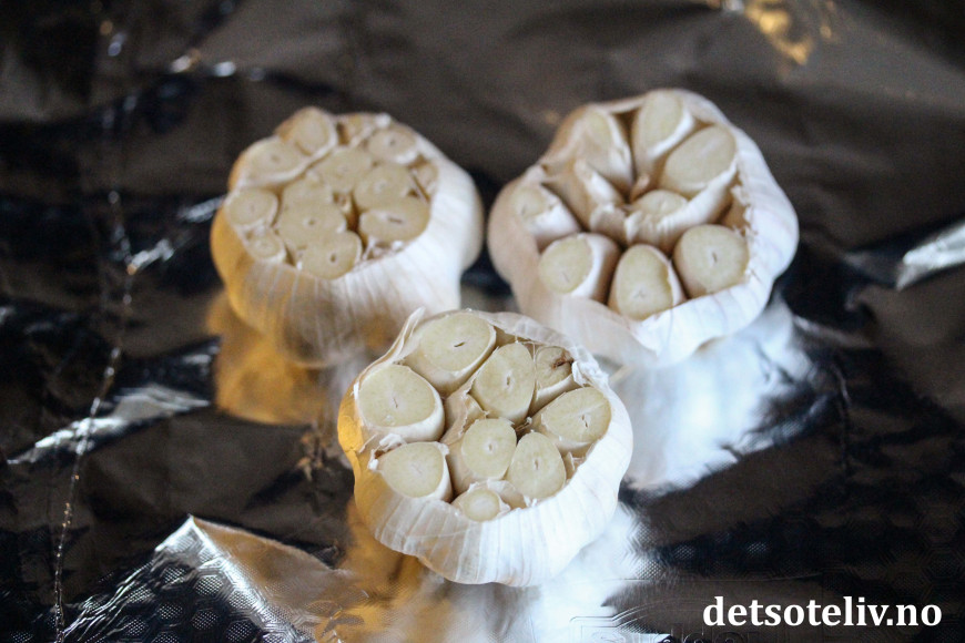 Pakk hvitløkene inn i folien. Sett dem på en stekeplate midt i ovnen og bak dem i ovnen ved 200°C i ca. 45 minutter.