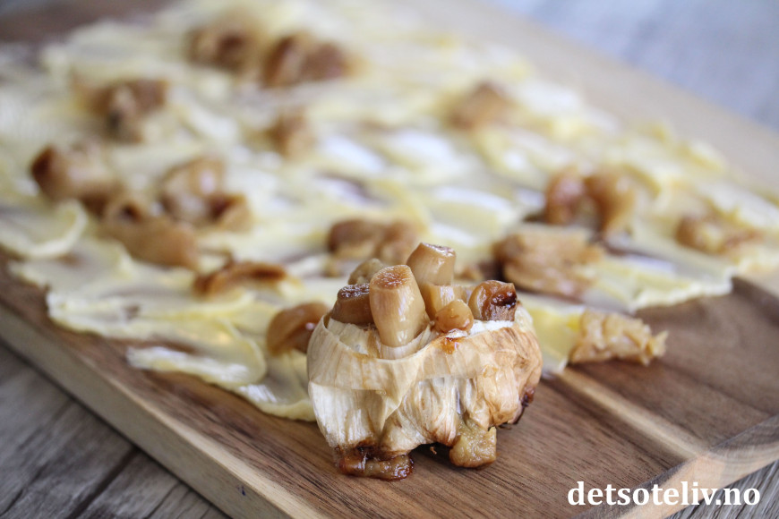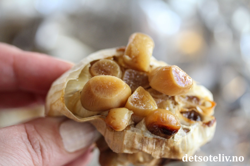 Hvitløksfeddene er nå så bløte at de vil tyte ut når du klemmer på undersidene av hvitløkene.. 😃