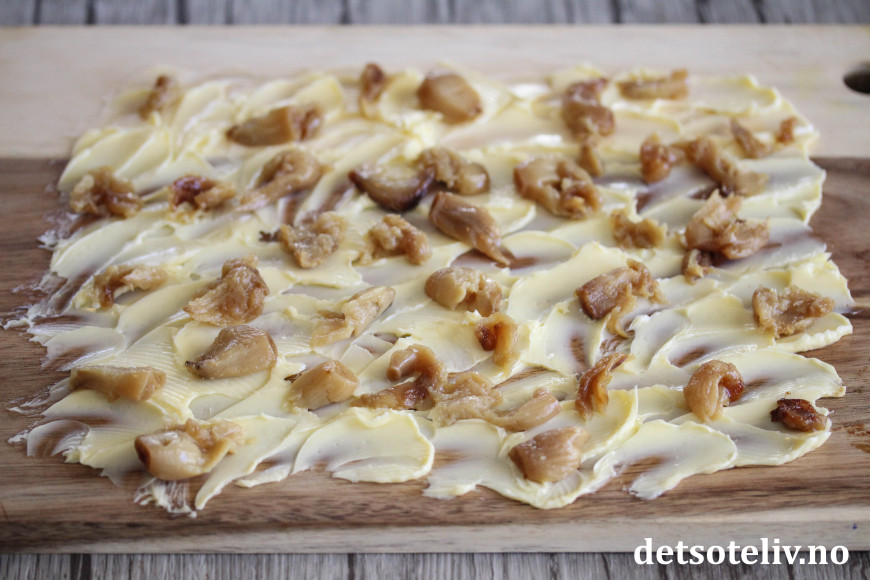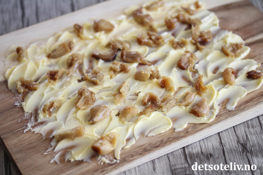 Fordel små klatter av bakt hvitløk jevnt utover smørbrettet (pass på at ingen av klattene blir alt for store).