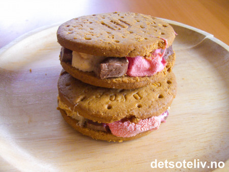Lag til 8 stk firkanter med aluminiumsfolie (ca 15x30 cm i størrelse). Legg 1 Digestive kjeks i midten på hver folie. Legg på biter av marshmallows (gjerne rosa og hvite, se tips) og melkesjokolade. Dekk med 1 Digestive kjeks og pakk folien sammen rundt kjeksene.