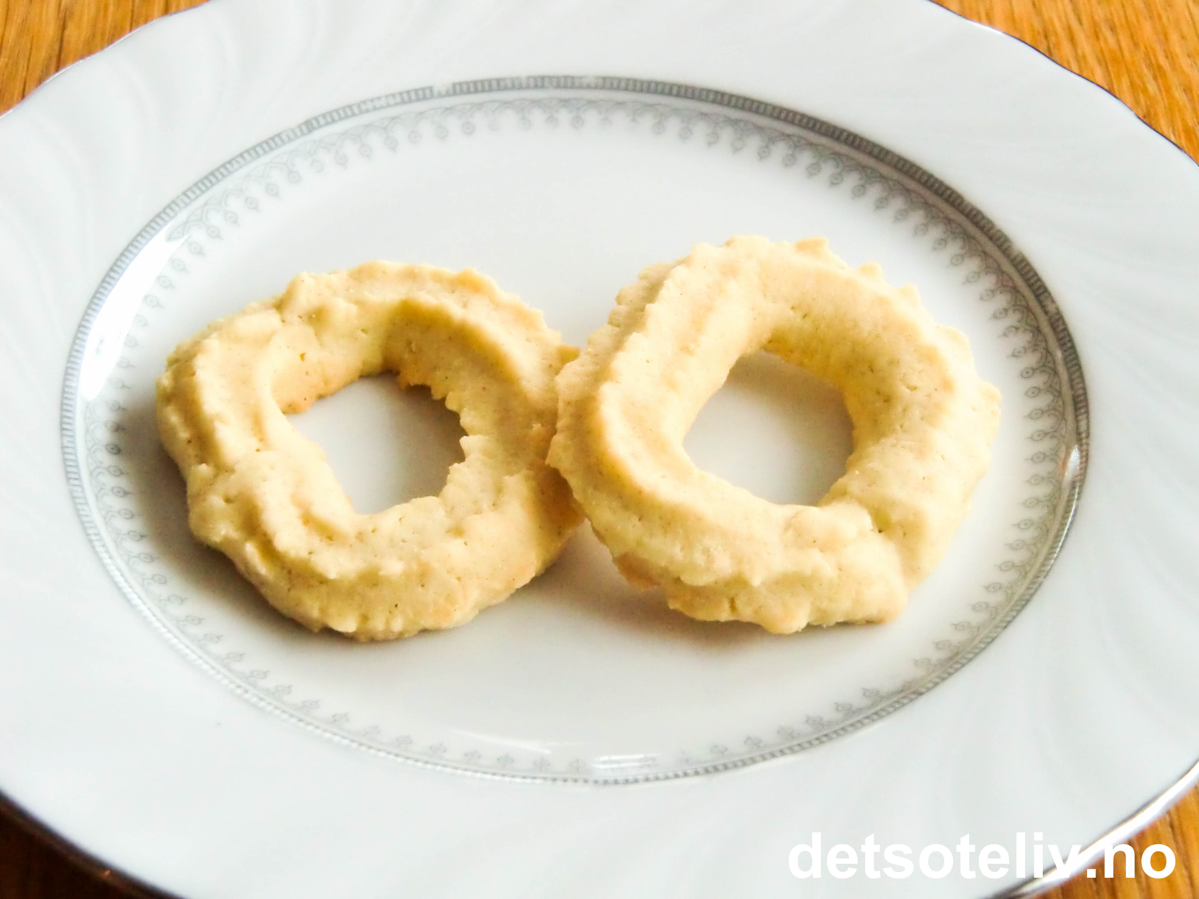 Trykk deigen gjennom en kjøttkvern med stjernetut. Kutt lengdene i mindre stykker på ca 8 cm, som formes til kranser på bakepapirdekkede stekeplater. Stekes midt i ovnen ved 180°C i ca 10 min. Avkjøles på rist.