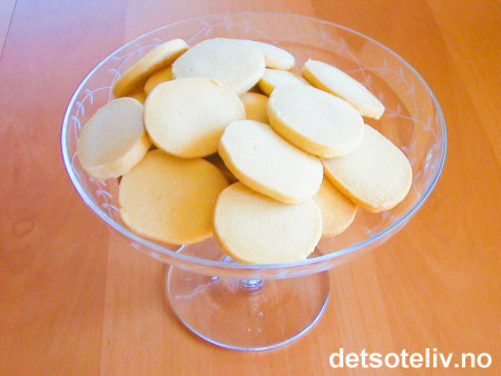 Skjær rullene opp i skiver på ca 0,4 cm med en skarp kniv og ha dem på bakepapirkledd stekeplate. Stek kakene midt i ovnen ved 180°C i 10 min. Kakene skal være lyse med litt farge i kantene. Avkjøl på rist.