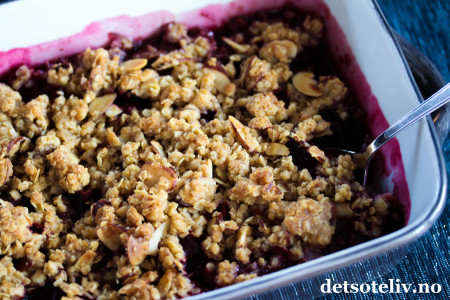 Stek kaken på rist nederst i ovnen ved 225°C i ca 20 min, til smuldredeigen er gylden. Serveres nystekt!