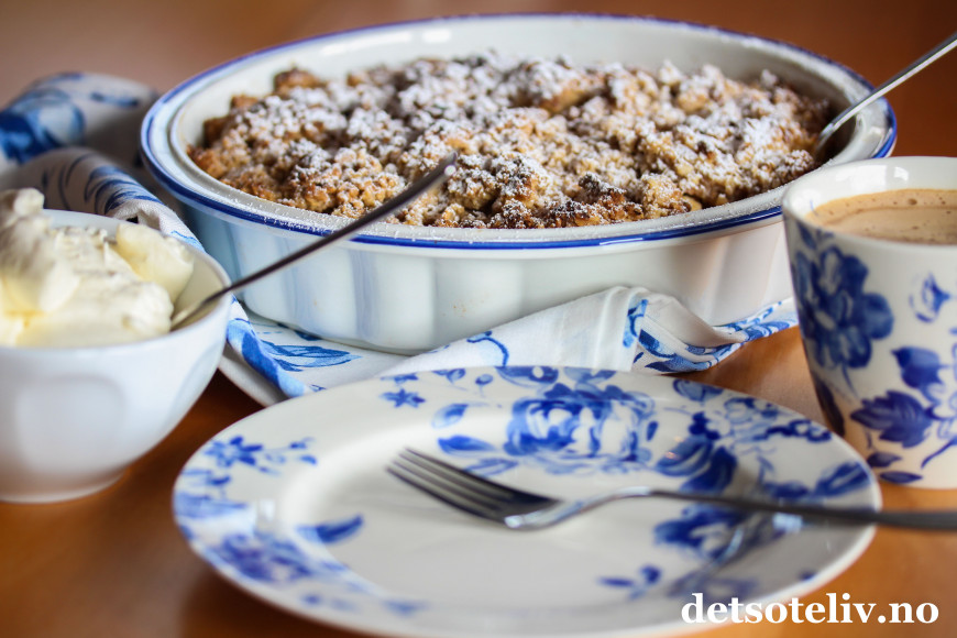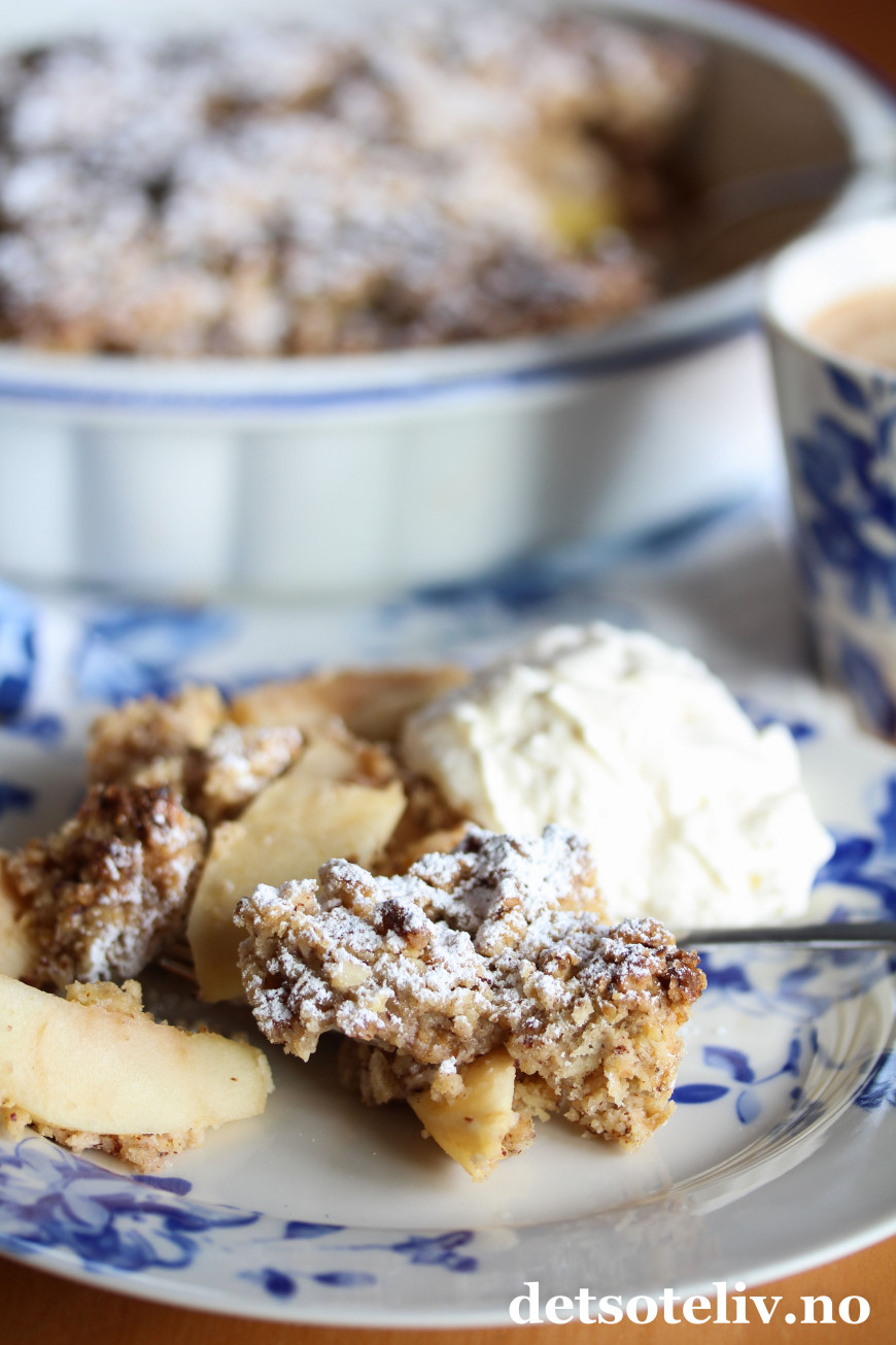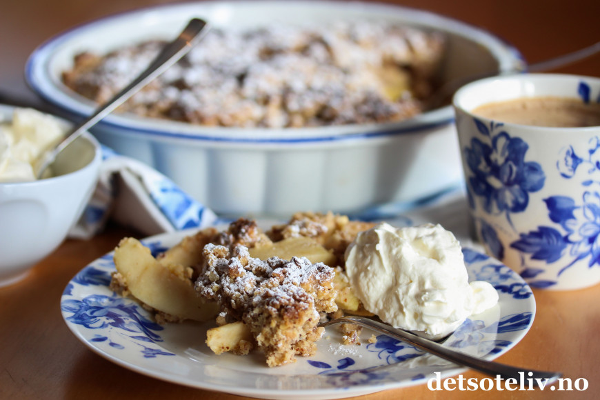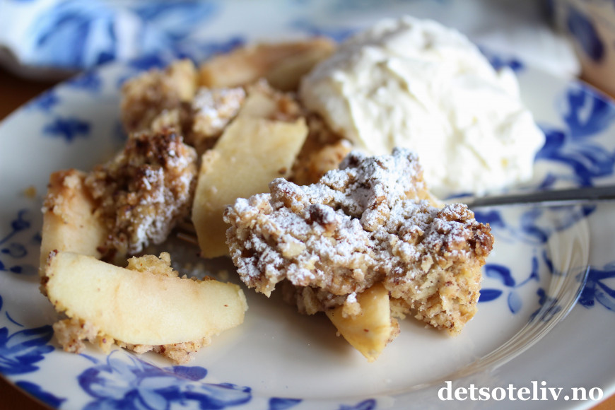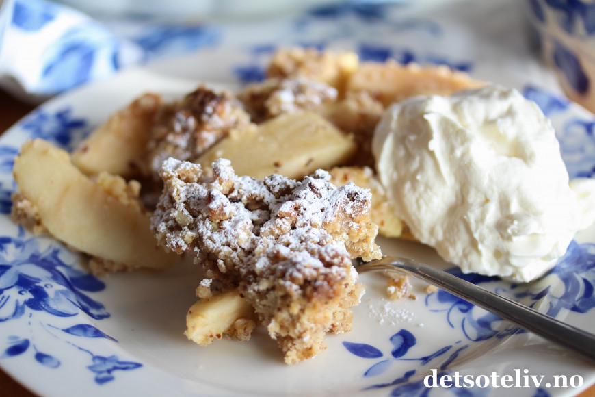 Da er det lite som slår en nystekt smuldrepai! Denne varianten lages med epler og en kjempegod smuldredeig med kanel og hasselnøtter.