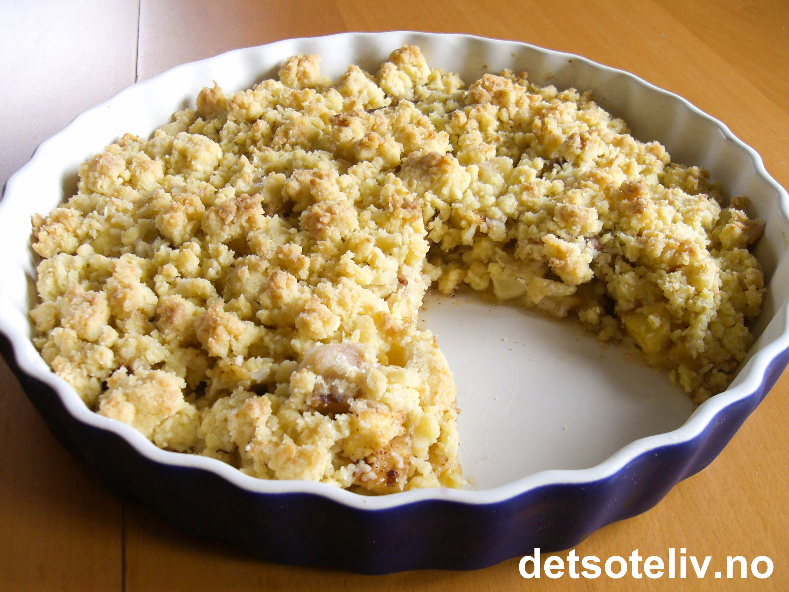 Fordel deigen over eplene i formen. Stek kaken midt i ovnen ved 200°C i 25 min, til smuldredeigen har fått gylden farge.