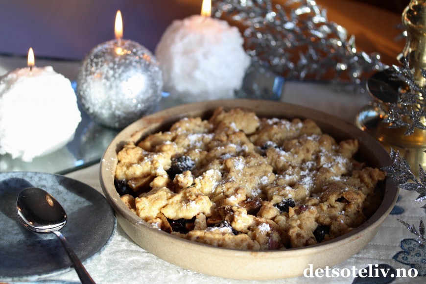 Fordel smuledeigen over frukten i formen. Stekes midt i ovnen ved 180°C i 35 min til kaken er gylden.