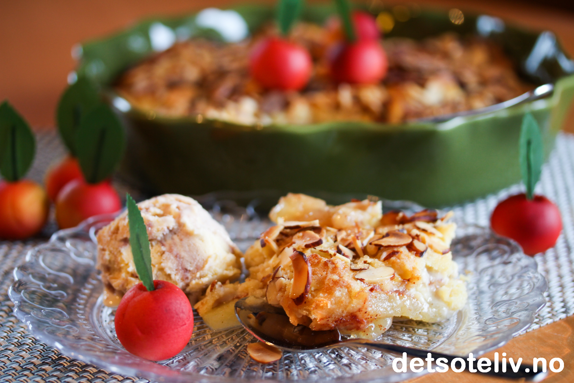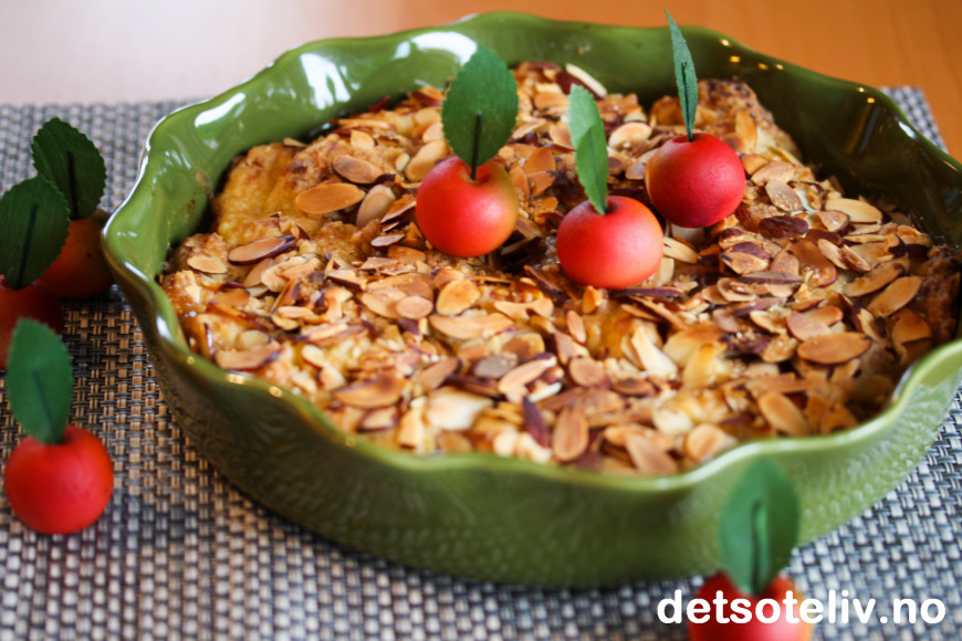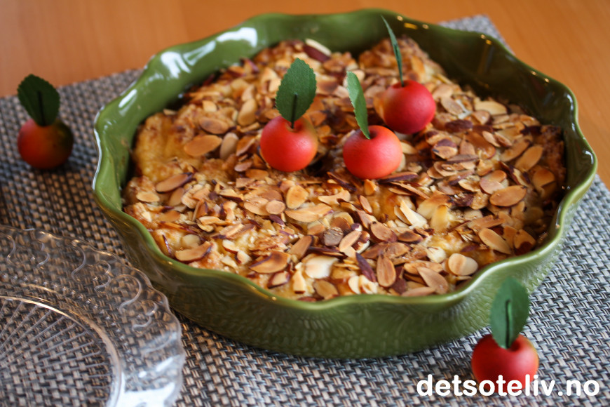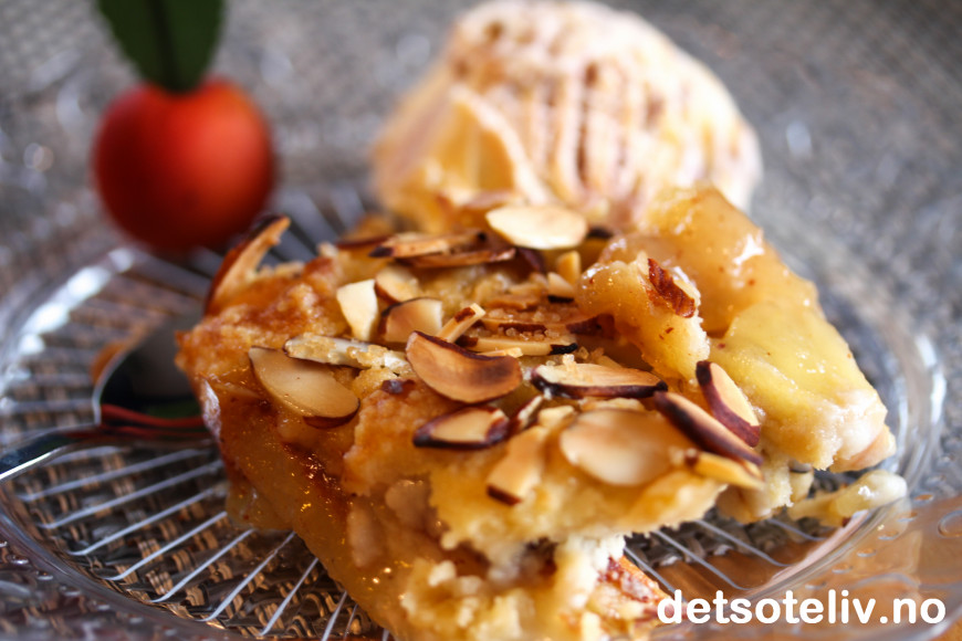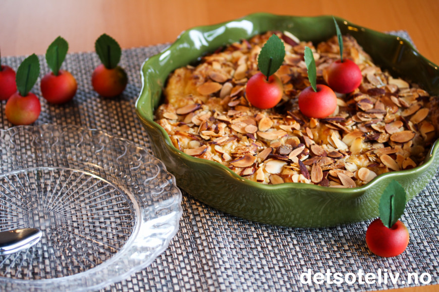 Jeg pyntet smuldrepaien med epler laget av marsipan, som jeg synes ble veldig dekorativt!