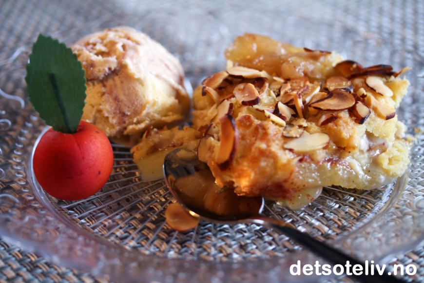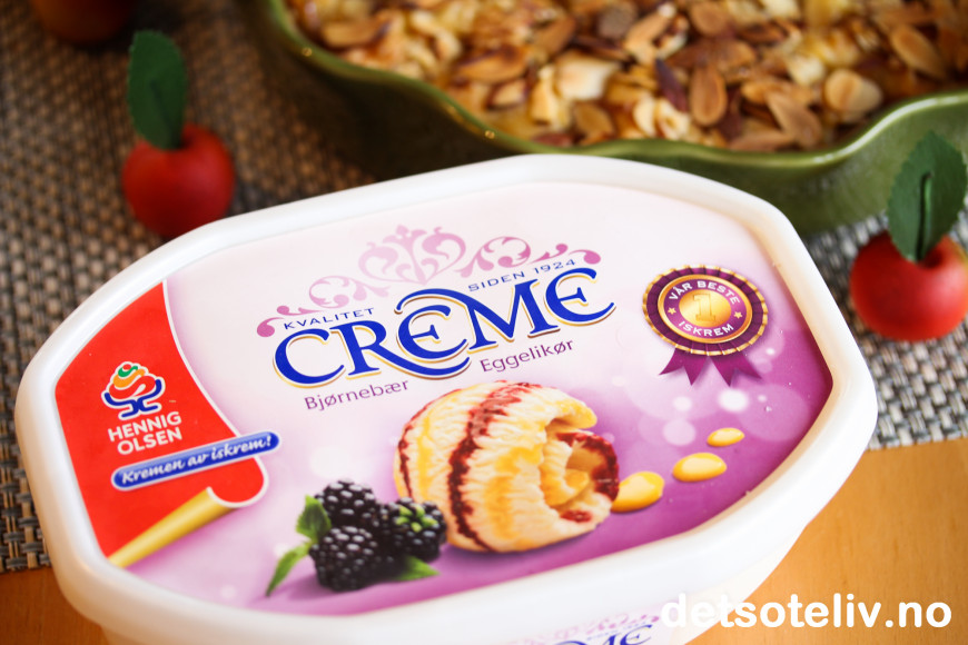 Jeg valgte meg her en av familiens favorittiskremer med bjørnebær og eggelikør, som akkompagnerte smakene fra den varme smuldrepaien på en utmerket måte!
