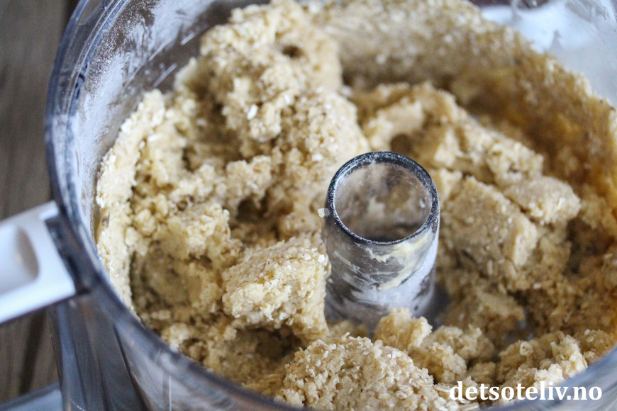 Ha smør, mel, sukker og havregryn til smuldredeigen i en food processor med hakkekniv og kjør på full hastighet til deigen samler seg.