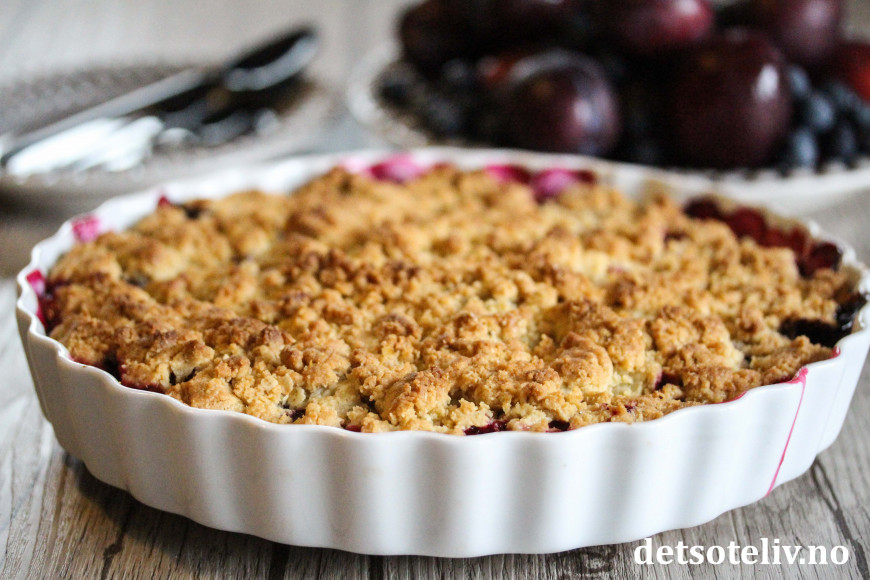 Du finner mine varianter av smuldrepai samlet HER. Denne gangen har jeg testet ut kombinasjonen plommer, blåbær og bringebær.