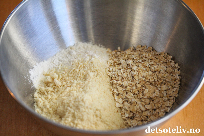 Bland mel, malte mandler, havregryn og brunt sukker.