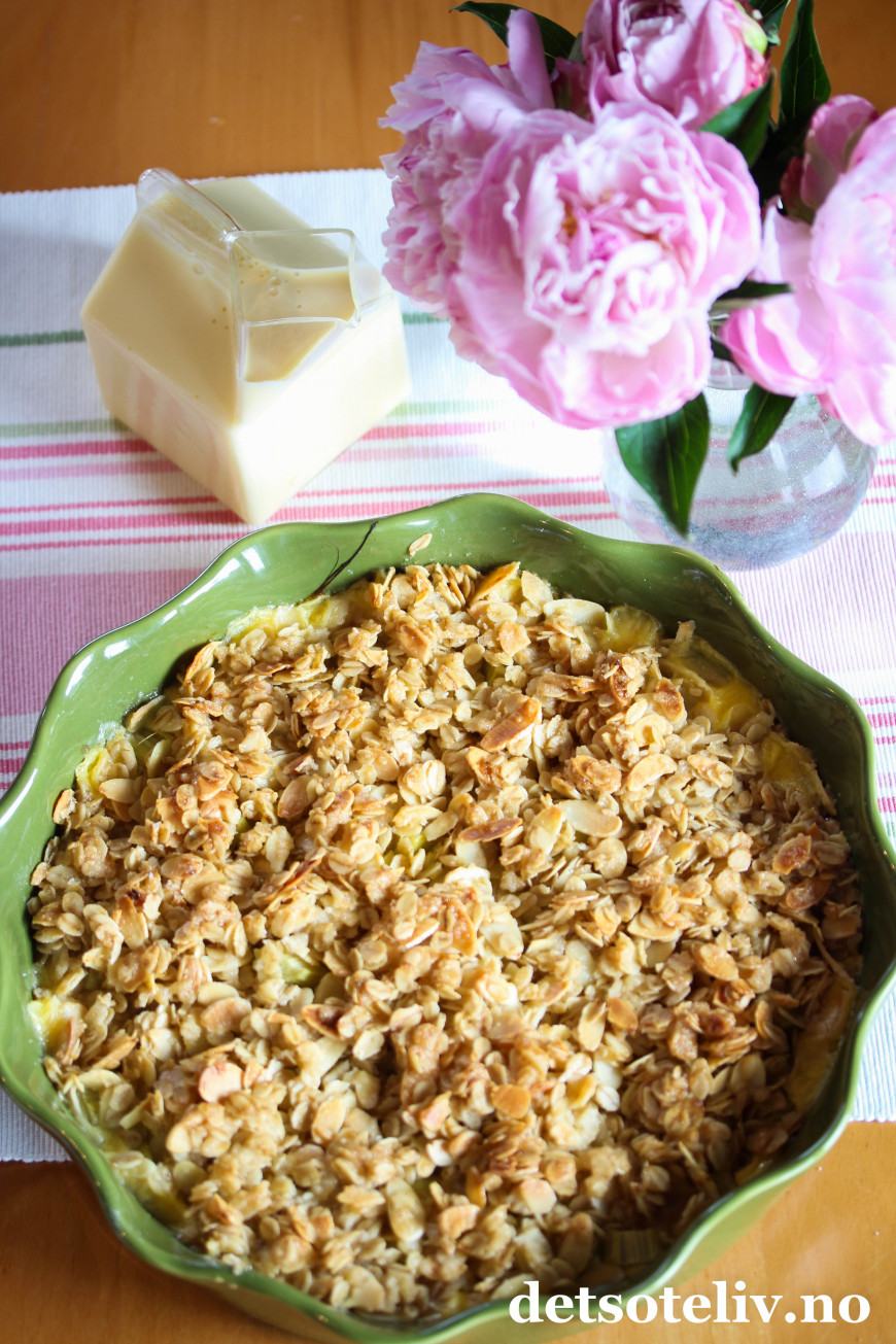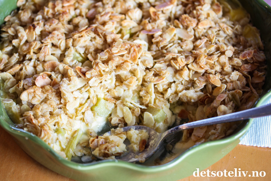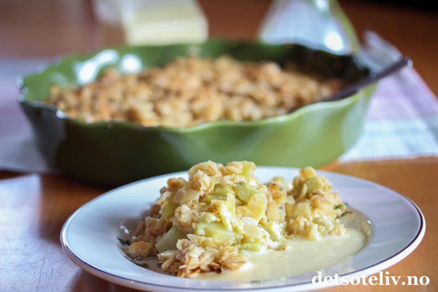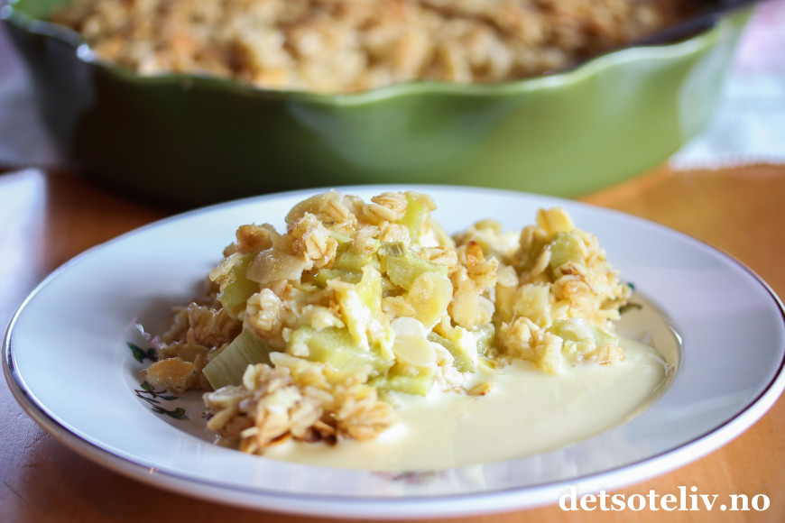 Syrlige rabarbra smaker deilig sammen med søt vaniljekrem. Smuldredrysset lages med store havregryn og mandelflak og blir sprøtt og crispy.