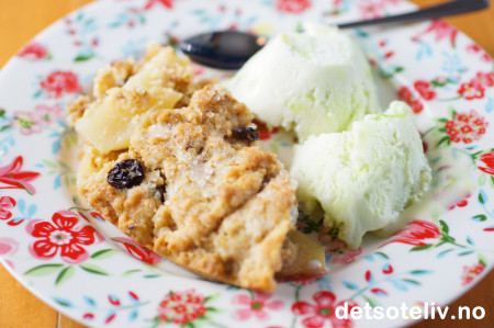 Stekes midt i ovnen ved 200°C i 20 min, eller til smuledeigen er gyllenbrun og sprø og eplene myke. Serveres nylaget med ønsket tilbehør!