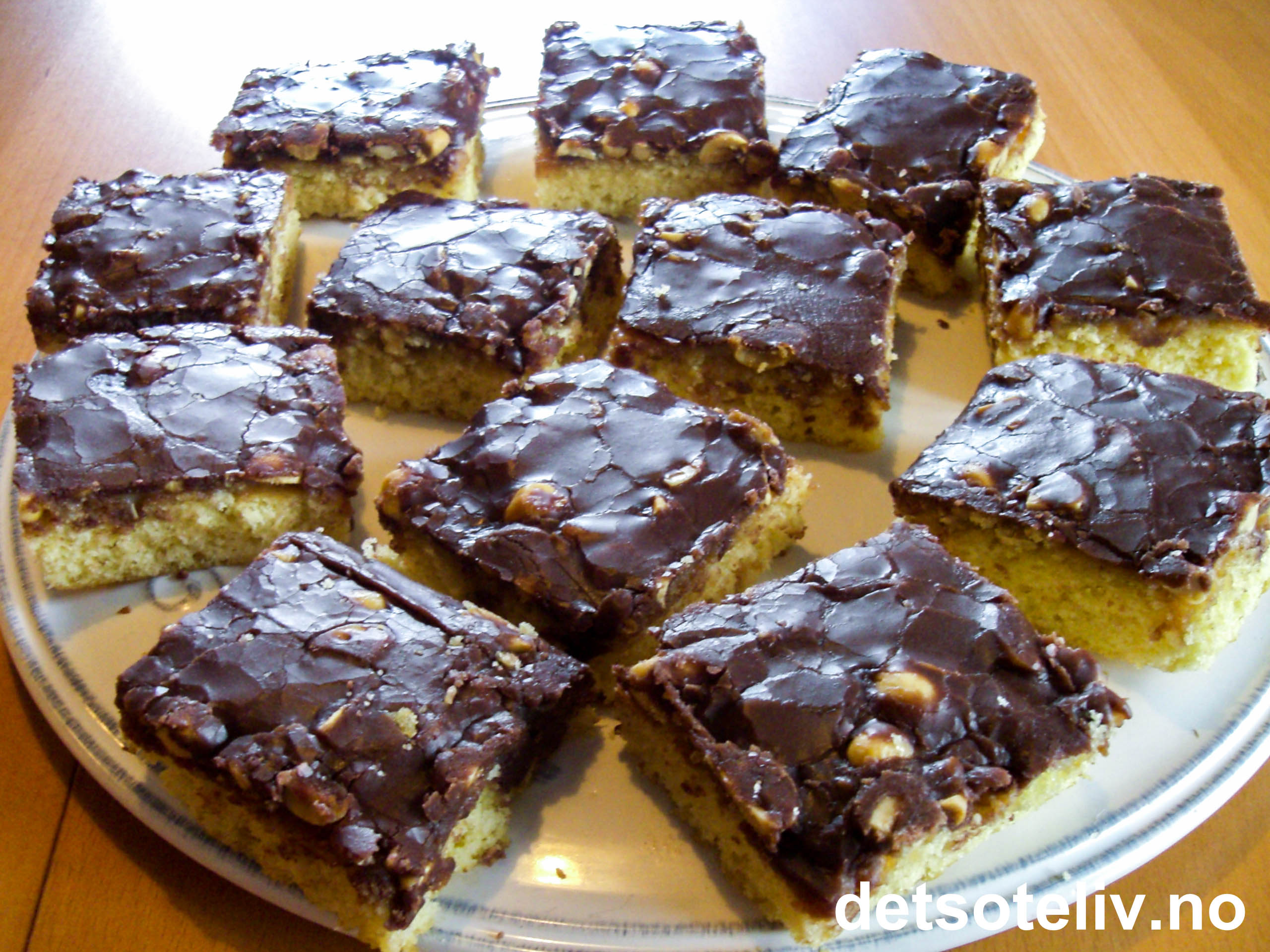 Merk at dette er en nokså søt og mektig langpannekake, og det kan være lurt å ikke dele kaken opp i altfor store firkanter.