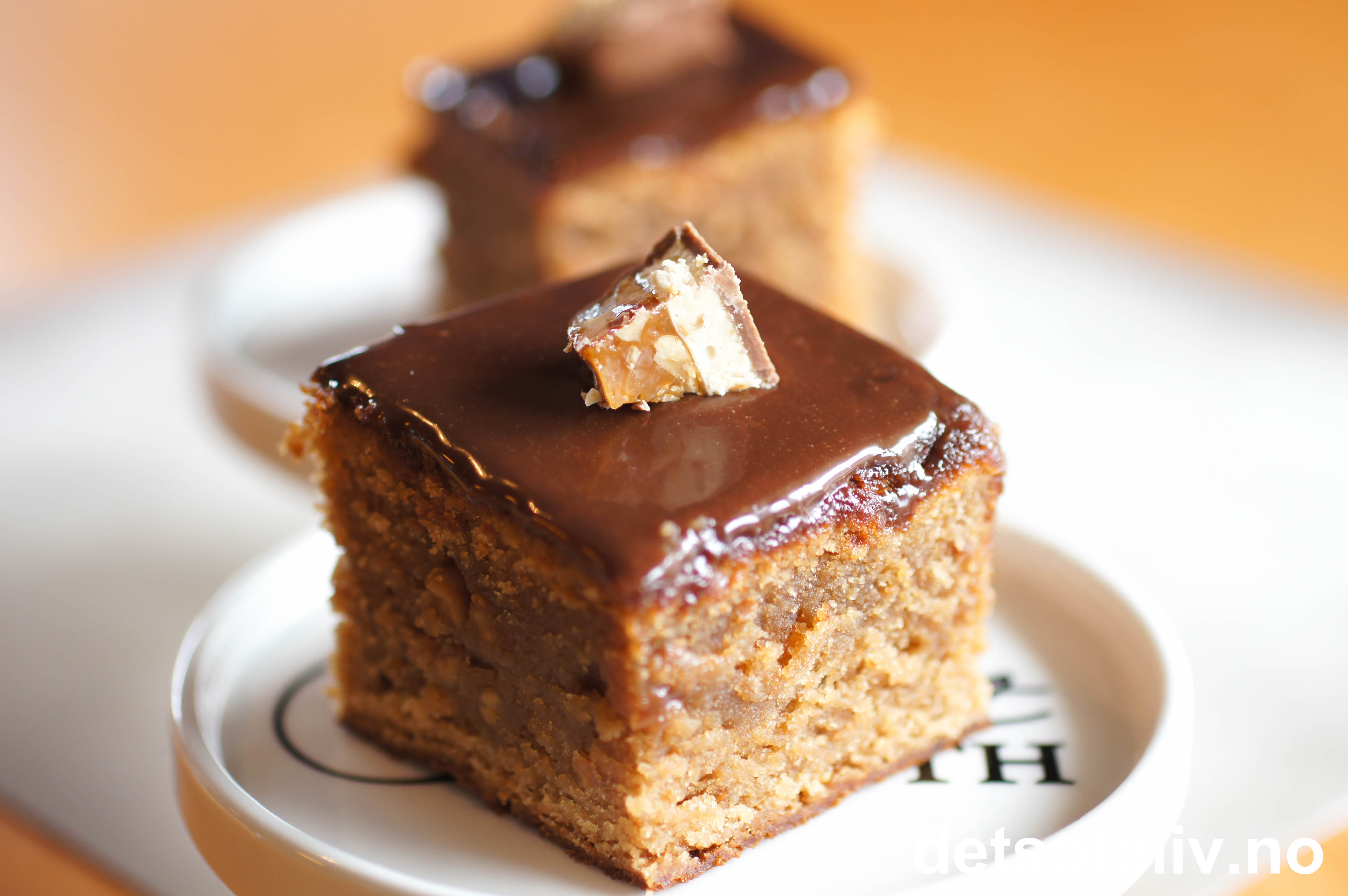 Hvis du vil kan du pynte hvert kakestykke med smeltet sjokolade og en liten bit Snickers.